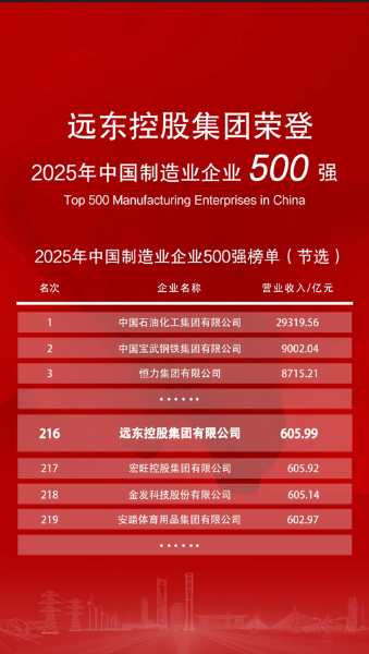 2025年9月20日,2025世界制造業(yè)大會在合肥盛大開幕。中國企業(yè)聯(lián)合會、中國企業(yè)家協(xié)會在大會開幕式上重磅發(fā)布“2025中國制造業(yè)企業(yè)500強”榜單,遠東控股集團憑借強勁的綜合實力位列榜單第216位,相較去年躍升13位,展現(xiàn)出企業(yè)在制造業(yè)領域持續(xù)進階的硬核實力。